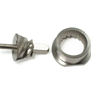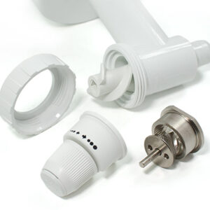 Die Kunststoffteile des Mahlwerkvorsatzes sind spülmaschinengeeignet (bei 50° C), mit Ausnahme der Einstelleinheit. Zum Anschluss der Getreidemühle wird das Zwischengetriebe benötigt.