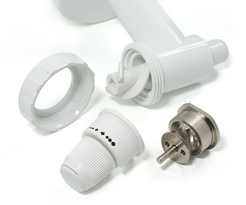 Die Kunststoffteile des Mahlwerkvorsatzes sind spülmaschinengeeignet (bei 50° C), mit Ausnahme der Einstelleinheit. Zum Anschluss der Getreidemühle wird das Zwischengetriebe benötigt.
