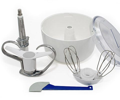 Die Rührschüssel ist auch aus rostfreiem Edelstahl mit 5 ℓ Fassungsvolumen und als Edelstahlknetschüssel mit 7,5 ℓ Fassungsvolumen erhältlich.